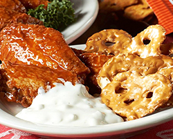 For the chicken salad, mix together 1 diced chicken breast, 3 tablespoons of hot sauce, ½ cup of light mayo, 3 tablespoons diced celery, 2 tablespoons diced white onion, and 2 tablespoons diced carrots. Let sit for the flavors to come together.