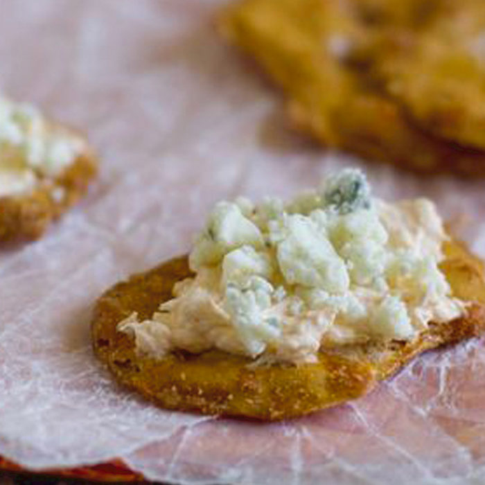 Mix whipped cream cheese with buffalo sauce, and spread on top of a Buffalo Pretzel Crisps.