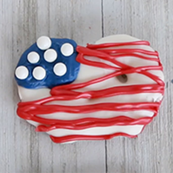 5. Lastly, use a piping bag to precisely create a horizontal striping pattern across the remaining exposed white candy melt to finish the American flag design.