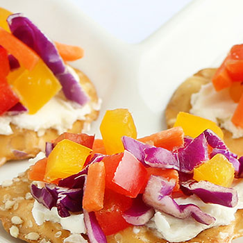 Chop and shred bell peppers, carrots, and cabbage. Spread cream cheese on Original Pretzel Crisps and add the veggies on top. Press into cream cheese.